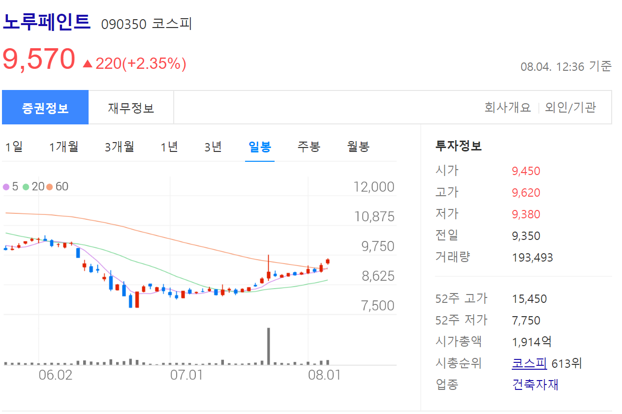 외장 내장 페인트 사업을 하고 있는 노루 페인트도 차트가 이쁘게 만들어 지고 있습니다.