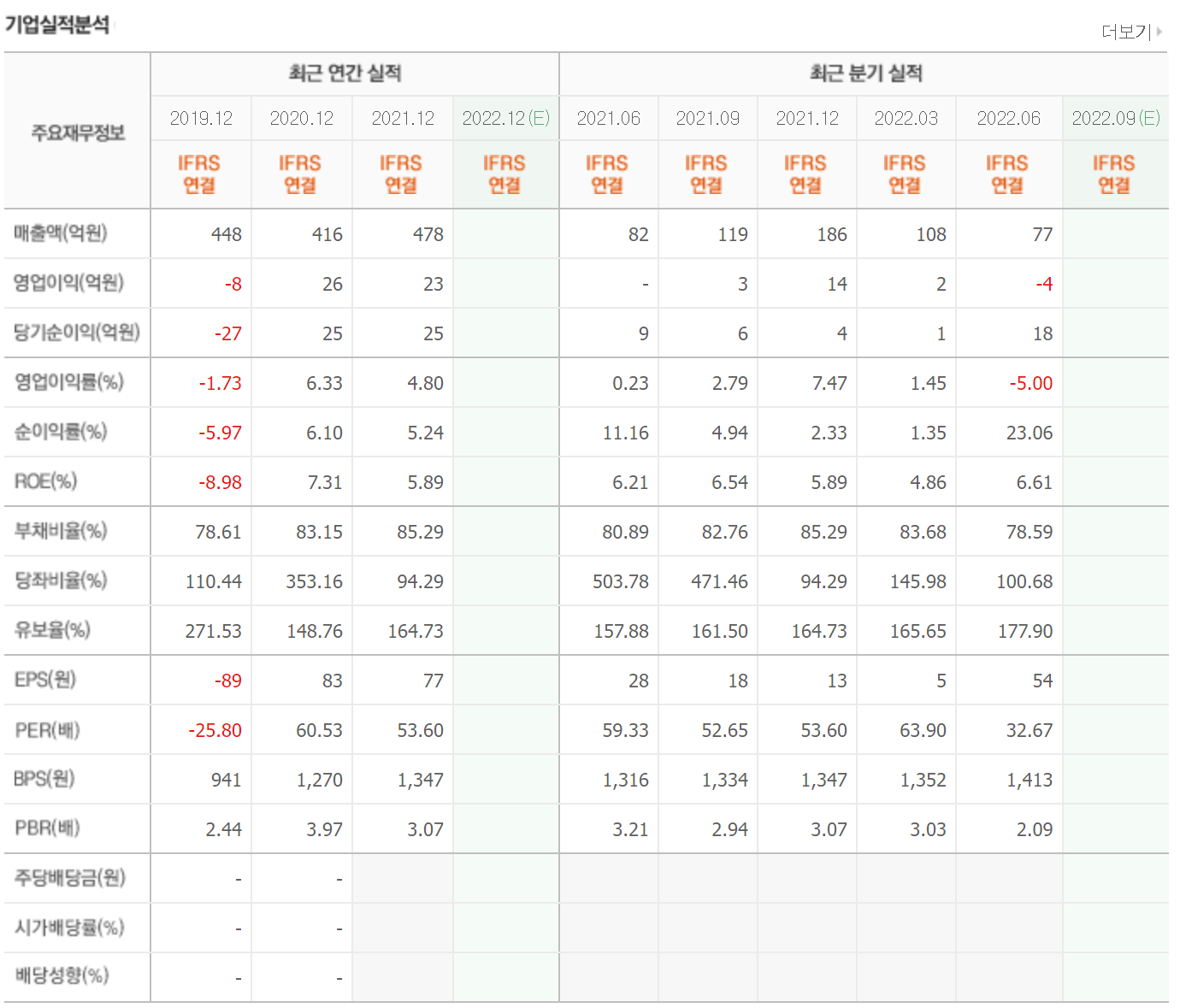 매년 3000억 이상의 매출을 발생시키고 있으며 2021년에는 흑자전환을 한 상태입니다. 유보율 또한 매우 높아 부도나 상장폐지에 대한 위험은 적은 상태입니다.