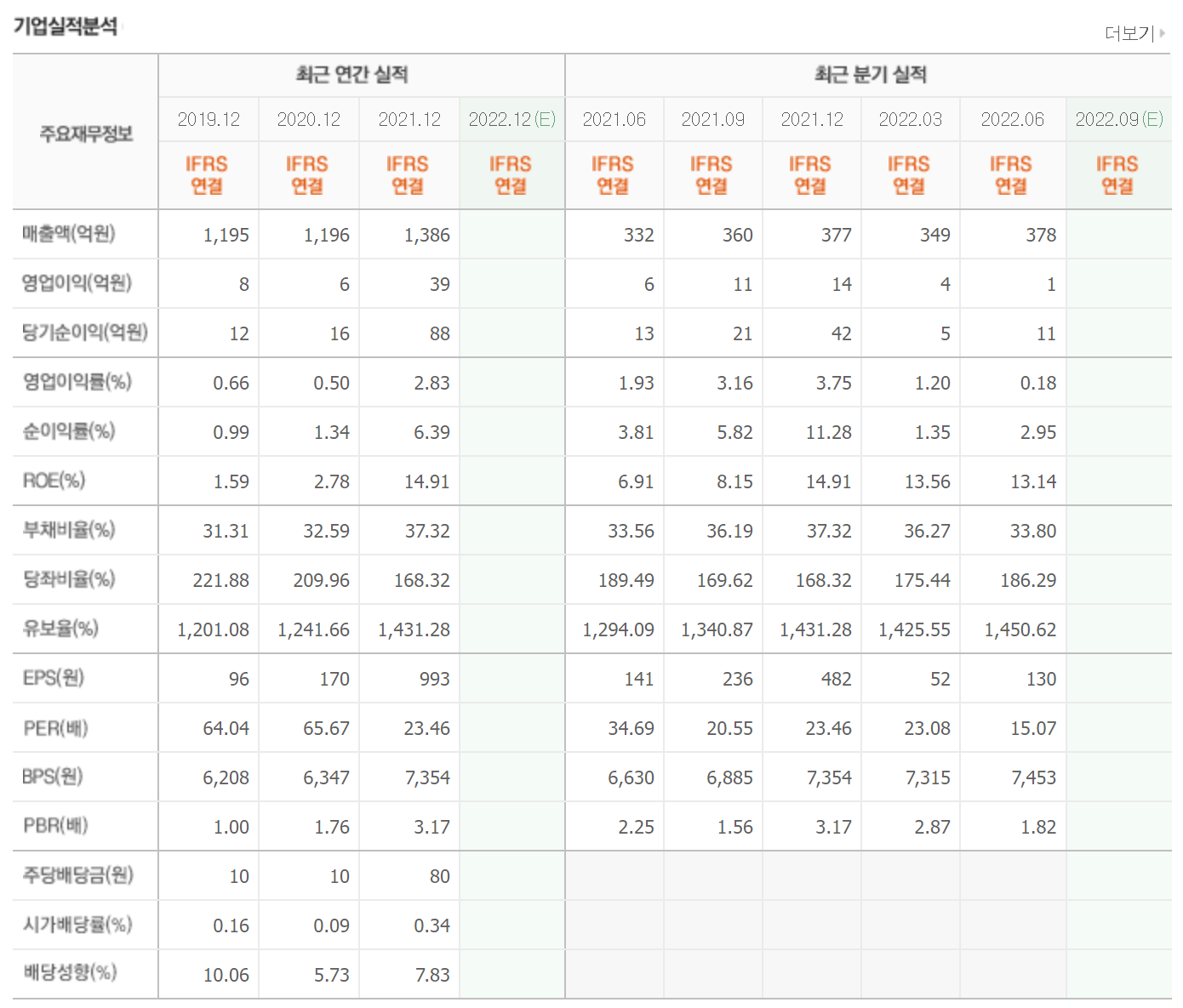 매년 1000억 이상의 매출을 올리고 있으며 매출은 2020년 이후 지속적으로 상승하고 있습니다. 2022년은 전년도 매출을 상회하는 실적이 예상되는 중입니다. 영업이익과 당기순이익 모두 상승할 것으로 예측되고 있습니다.