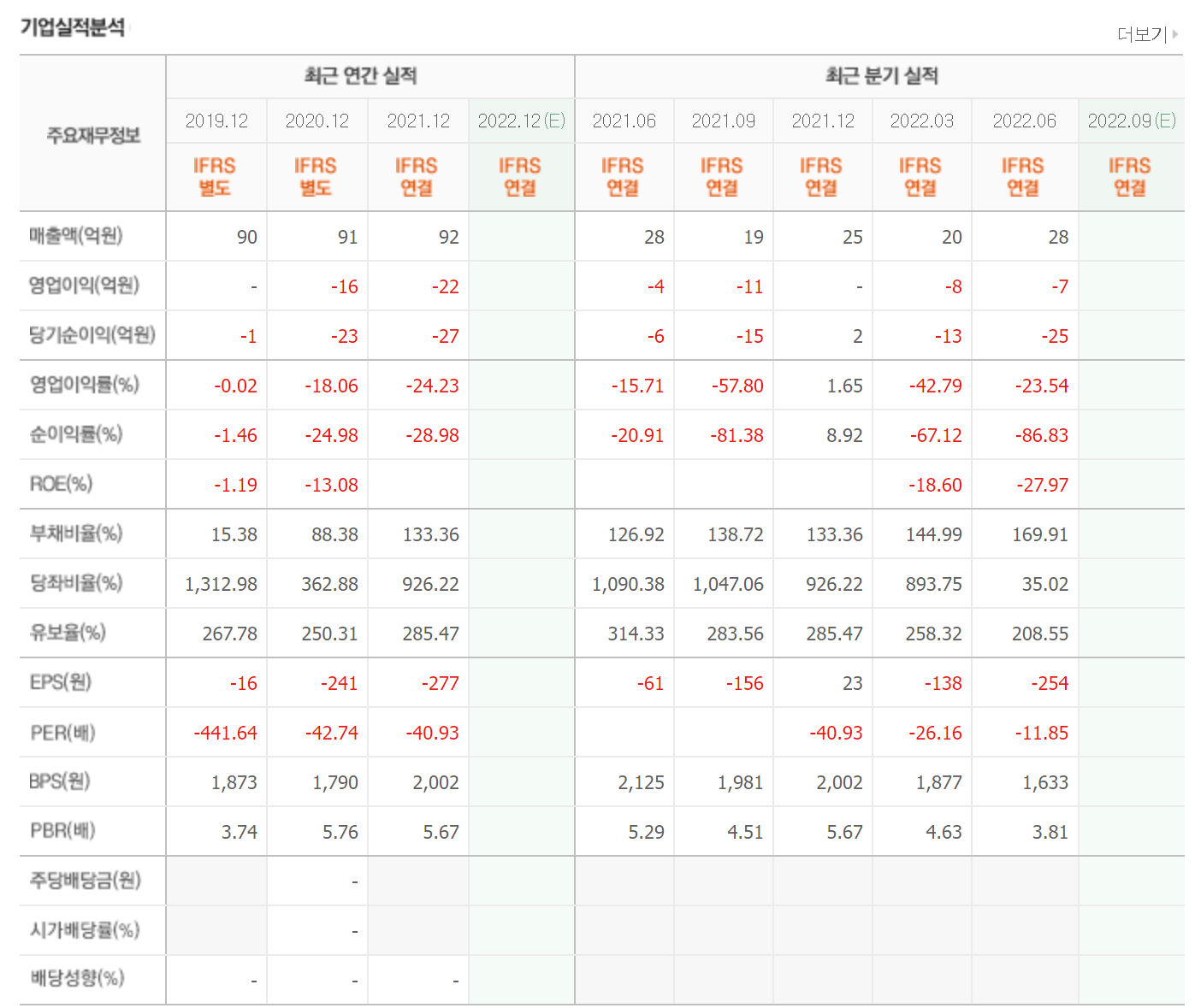 매년 90억의 매출을 발생시키고 있으나 영업이익과 당기순이익은 적자를 유지하고 있습니다. 실적 기준으로는 리스크가 있는 상태입니다.