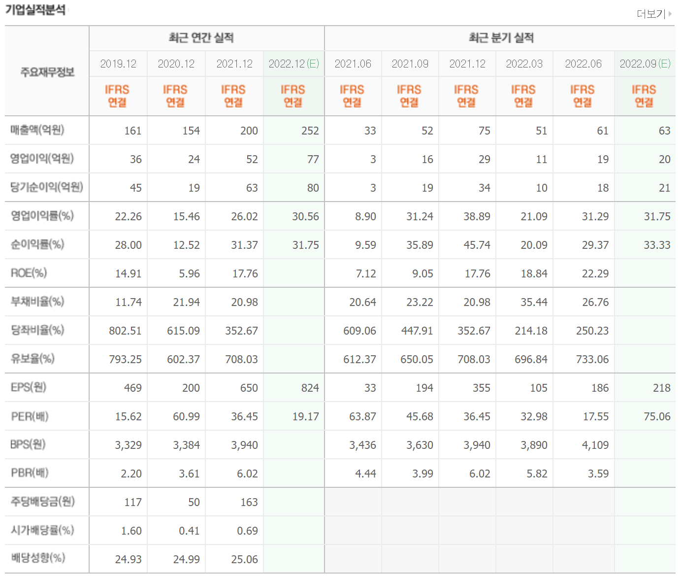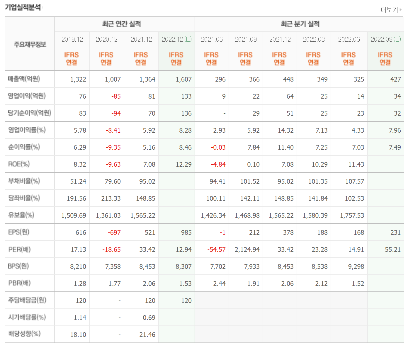 매년 1000억 이상의 매출을 올리고 있으며 매출은 2020년 이후 지속적으로 상승하고 있습니다. 2022년은 전년도 매출을 상회하는 실적이 예상되는 중입니다. 영업이익과 당기순이익 모두 상승할 것으로 예측되고 있습니다.