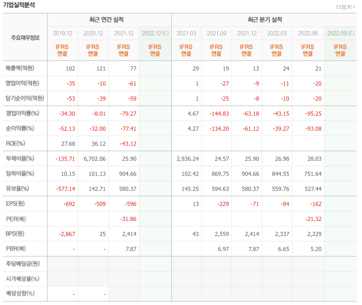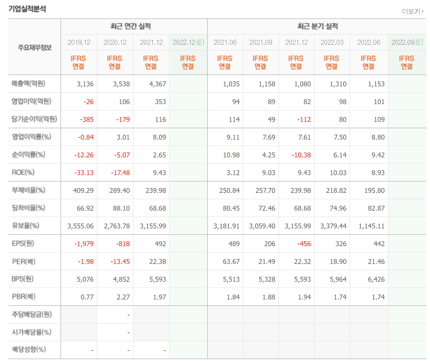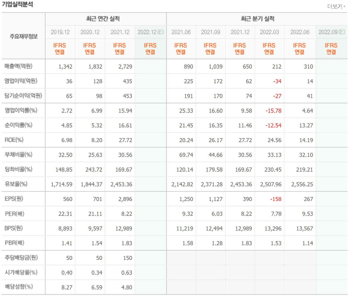 매년 3000억 이상의 매출을 발생시키고 있으며 2021년에는 흑자전환을 한 상태입니다. 유보율 또한 매우 높아 부도나 상장폐지에 대한 위험은 적은 상태입니다.