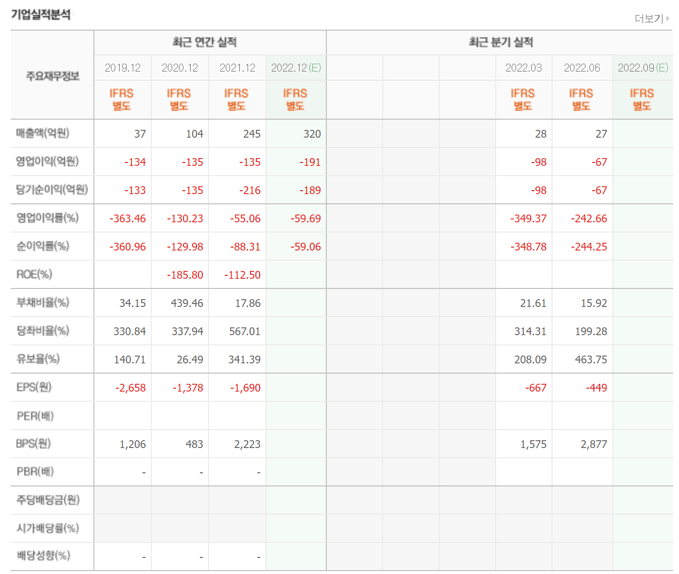 매년 매출은 급격하게 증가하고 있으나 신규상장주인 만큼 영업이익이나 당기순이익은 적자를 유지중입니다. 이런 종목은 실적보다는 미래 성장성을 보고 투자해야 합니다.