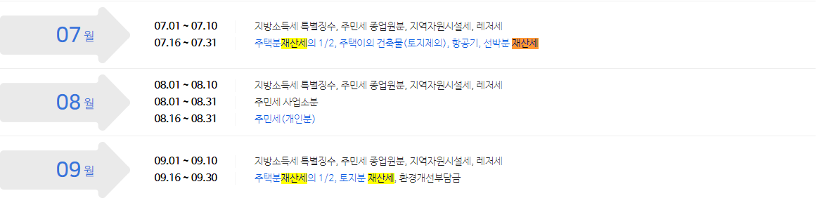 - 7월 16일 ~ 7월 30일 : 주택분재산세의 1/2, 주택이외 건축물(토지제외), 항공기, 선박분 재산세