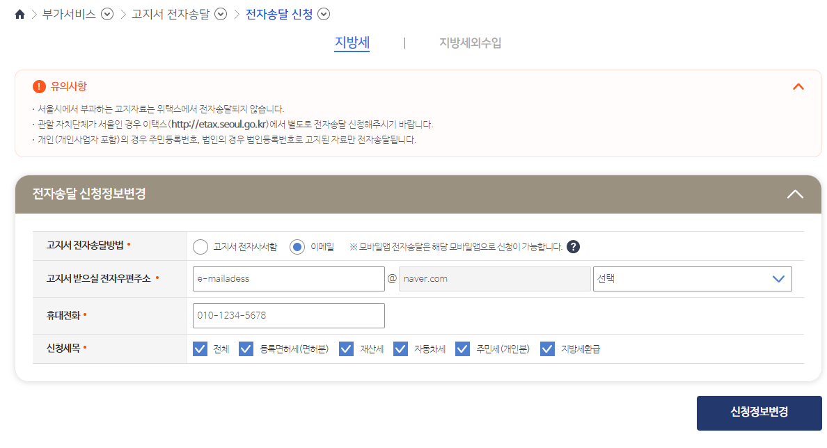 이런식으로 신청세목과 메일 주소와 휴대전화를 입력하면 모든 지방세에 대해서 이메일 또는 휴대전화로 고지서를 받을 수 있습니다.