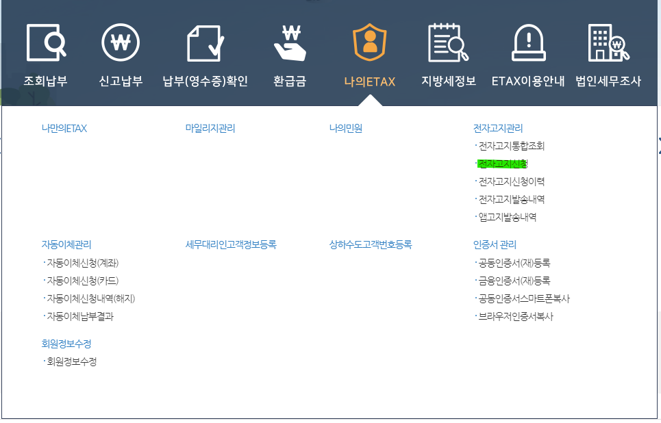 나의 ETAX에서 전자고지관리 - 전자고지신청을 신청하시면 됩니다.