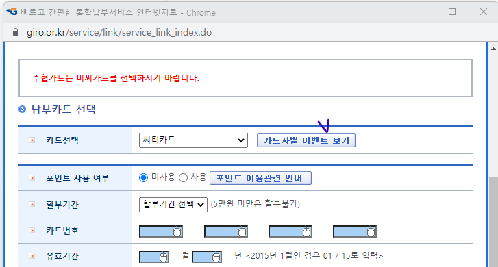 납부버튼을 클릭하면 "카드사별 이벤트 보기"를 클릭하면 소유하고 있는 카드사별 무이자 혜택을 찾아볼 수 있습니다.