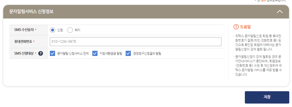 문자알림서비스 또한 휴대전화번호만 입력하고 신청하면 납부시기가 도래하면 알림을 받을 수 있습니다.
