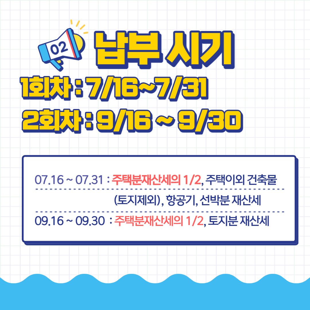 - 7월 16일 ~ 7월 30일 : 주택분재산세의 1/2, 주택이외 건축물(토지제외), 항공기, 선박분 재산세