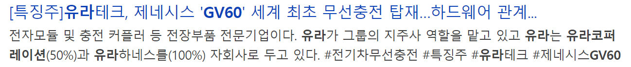 유라테크의 관계사인 유라코퍼레이션은 자동차 배선시스템(와이어링하네스)과 전자모듈 및 충전 커플러 등 전장부품 전문기업입니다. 현대차가 세계최초로 무선 충전 기능을 탑재한 제네시스 전기차 'GV60'에 유라테크의 관계사인 유라코퍼레이션이 무선 충전 기능 구현에 필요한 일부 하드웨어를 제작하는 것으로 알려져 관련주로 편입되어 있습니다.