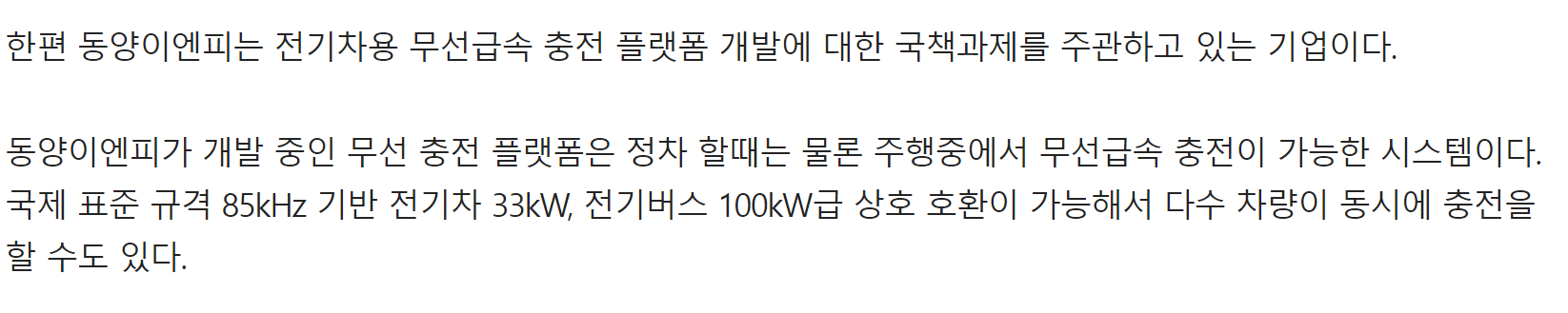 동양이엔피가 개발 중인 무선 충전 플랫폼은 정차 할때는 물론 주행중에서 무선급속 충전이 가능한 시스템입니다. 국제 표준 규격 85kHz 기반 전기차 33kW, 전기버스 100kW급 상호 호환이 가능해서 다수 차량이 동시에 충전을 할 수도 있는 것으로 알려져 있습니다.