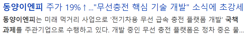 동양이엔피는 전기차용 무선급속 충전 플랫폼 개발에 대한 국책과제를 주관하고 있는 이력이 있어 전기차 무선충전 관련주로 편입되어 있습니다.