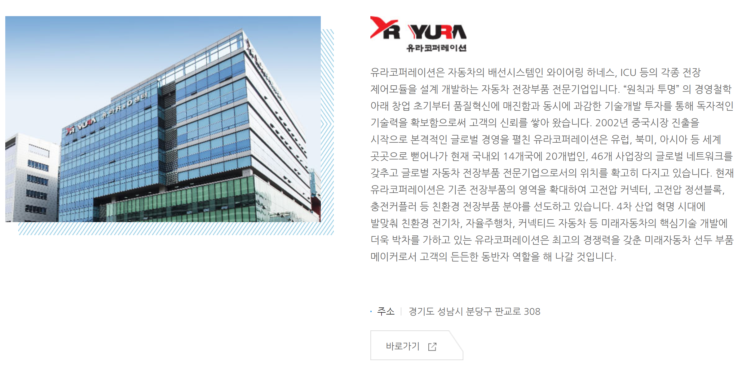 유라코퍼레이션은 자동차의 배선시스템인 와이어링 하네스, ICU 등의 각종 전장 제어모듈을 설계 개발하는 자동차 전장부품 전문기업입니다.