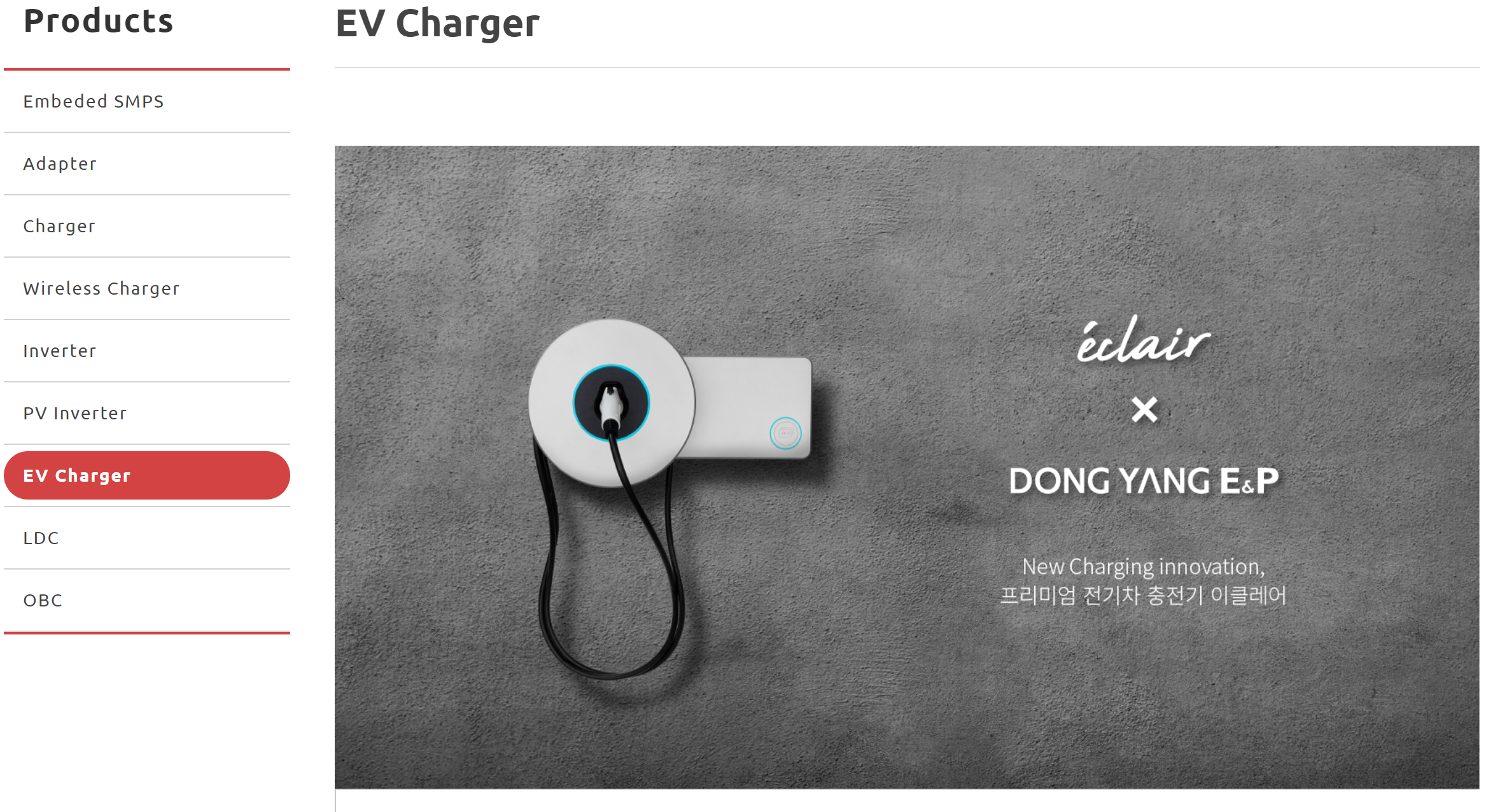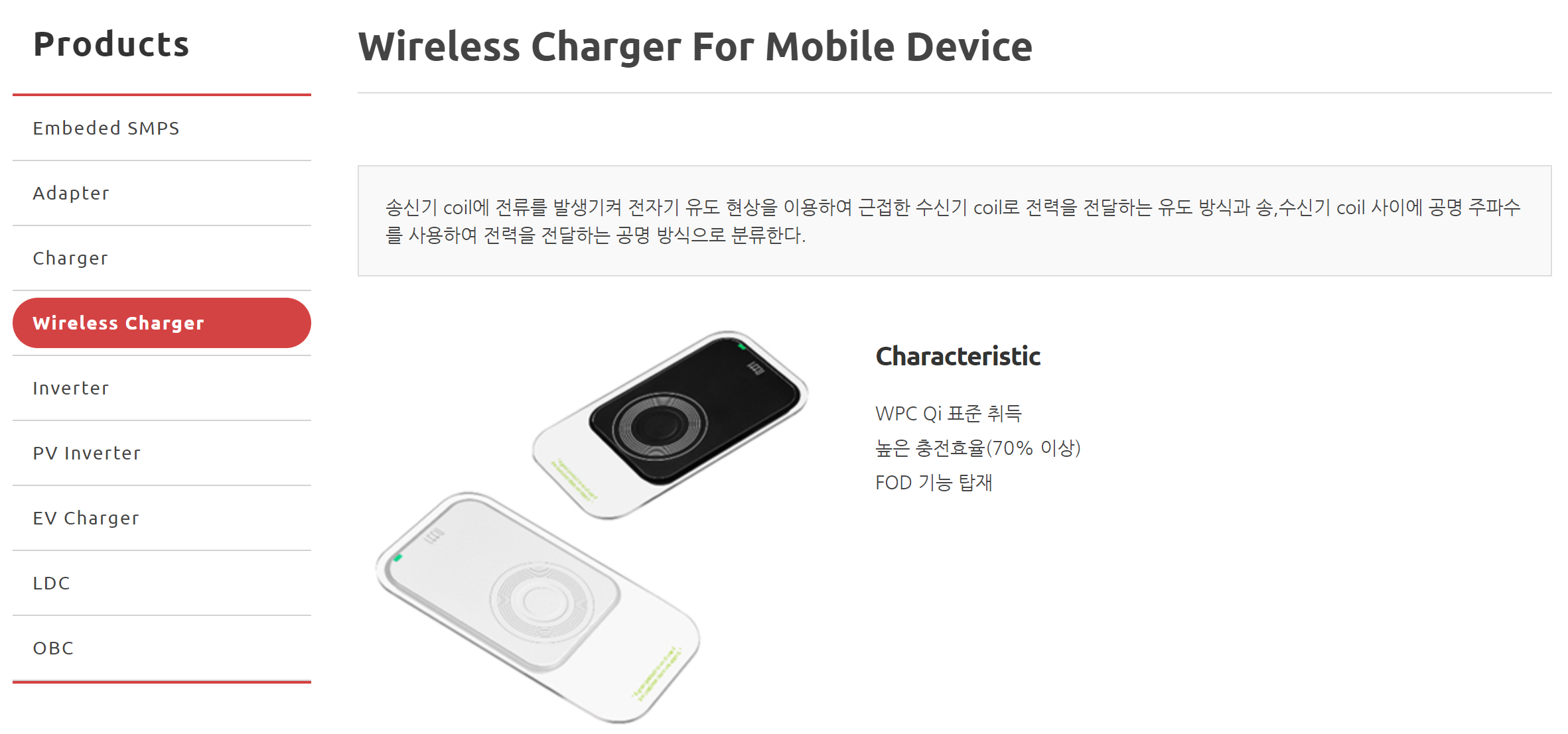 주요 제품으로는 무선충전기와 전기차 충전기가 있습니다.