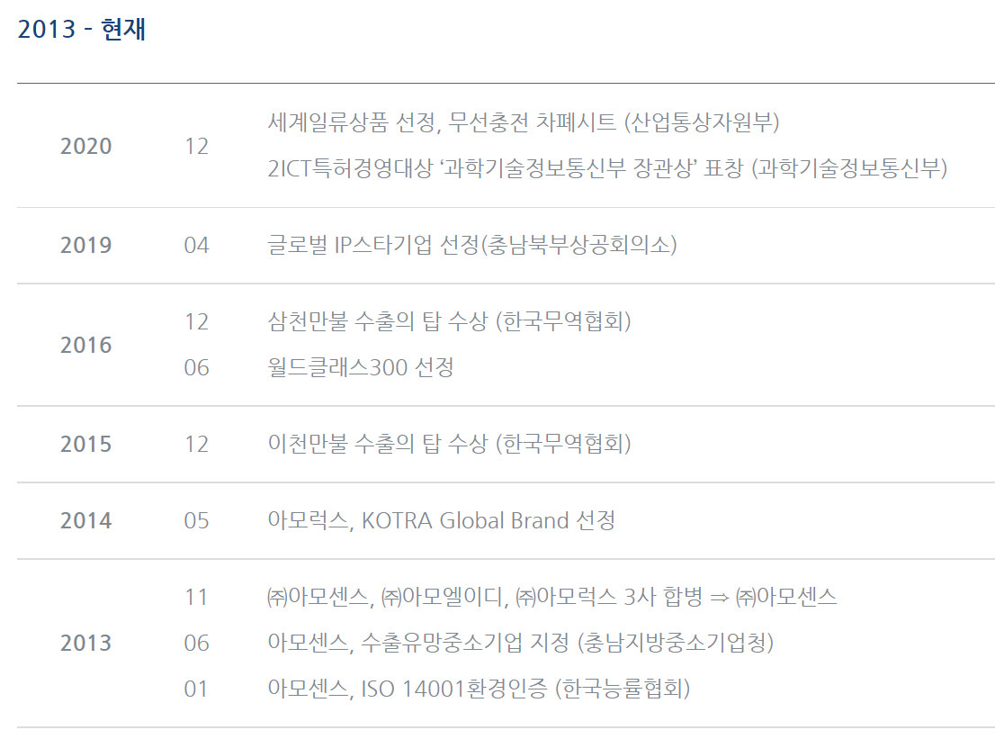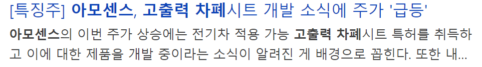 아모센스는 2018년 전기차에 적용 가능한 고출력 차폐시트에 대한 특허를 출원해 지난해 '고출력 하이브리드 자기장 차폐시트' 특허 등록을 완료한 이후 전기차용 무선충전 제품 개발 중이어서 전기차 무선충전 관련주로 편입되어 있습니다.