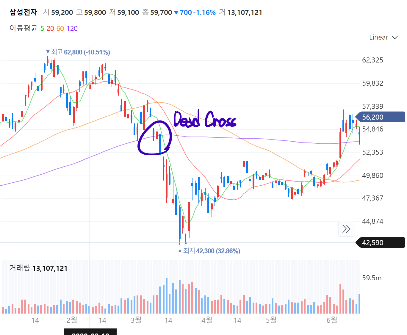 단기 이평선이 하락하며 장기이평선과 교차하는 구간을 데드크로스라고 합니다.