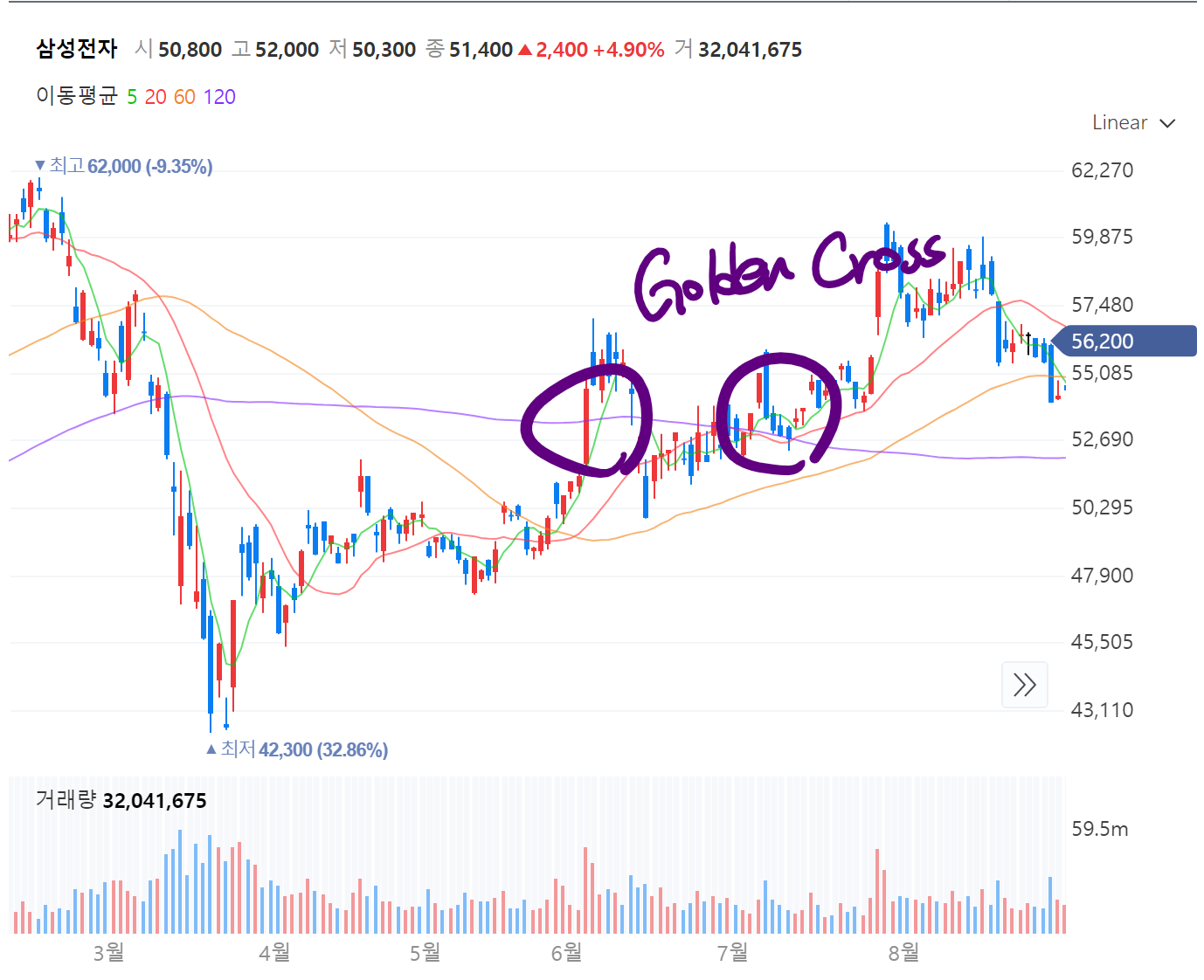 앞에서 말했던 것 처럼 단기 이동평균선이 상승하며 장기이동평균선과 만나는 구간을 말하는데