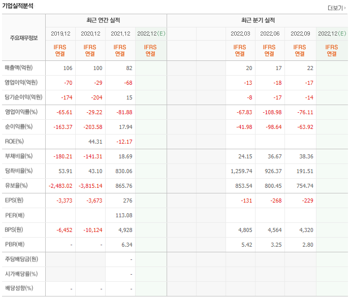 매년 100억 규모의 매출을 올리고 있으나 영업이익은 적자를 지속하고 있습니다. 단 2021년 당기 순이익은 흑자로 전환하였고 유보율과 부채비율이 개선된 모습이 눈에 띕니다.
