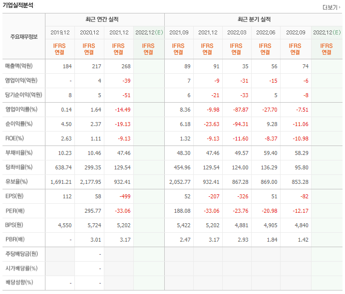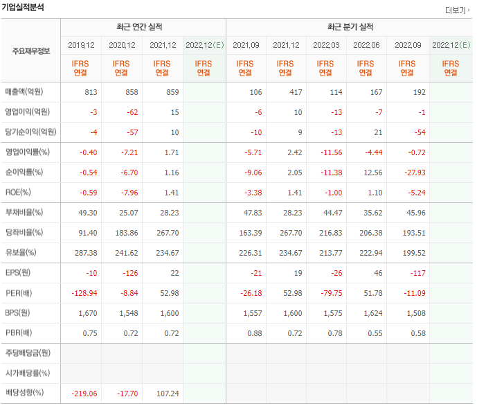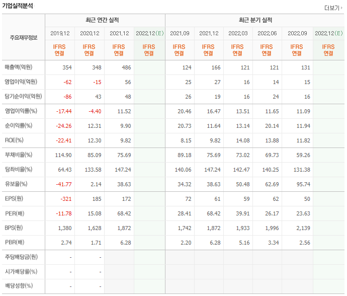 매년 300억 중반에서 400억 중반의 매출을 달성하고 있습니다. 영업이익은 적자를 지속하다가 2021년 흑자전환하였으며 당기순이익은 2020년부터 흑자 전환 후 흑자를 유지중입니다. 단, 유보율이 매우 낮은 상태라는 점이 이 종목의 리스크라고 할 수 있겠습니다.