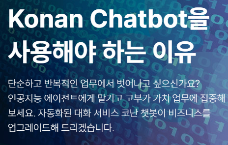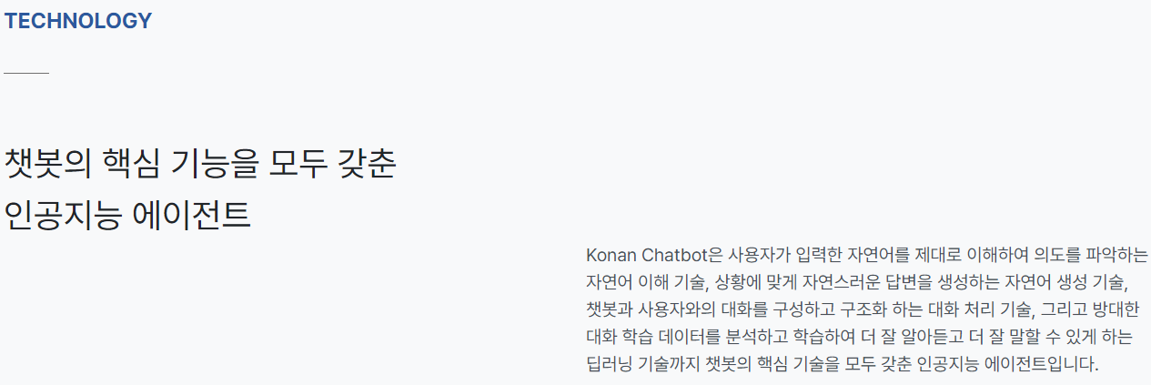 코난테크놀로지는 주요 기반기술을 기준으로 4제품군, 8제품으로 라인업 하고 있으며 4제품군은 딥컨버세이셔널에이전트[코난챗봇], 딥비전[코난와처], 딥스피치[코난보이스],[코난리스너] 그리고 딥텍스트애널리틱스가 있습니다.