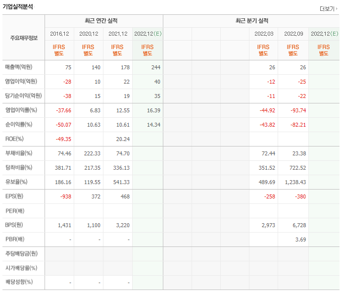 매년 100억 후반에서 200억 초반의 매출을 기록하고 있습니다. 2021년 영업이익은 적자전환을 한 상태입니다. 부채비율과 유보율은 준수한 편입니다.