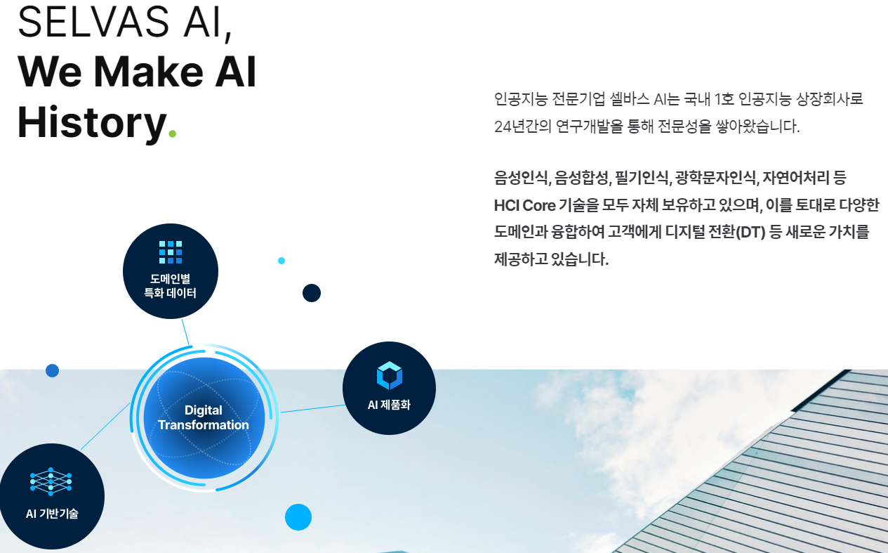 셀바스AI는 1999년 회사를 설립하여 2009년 상장한 국내 1호 인공지능 전문기업입니다.