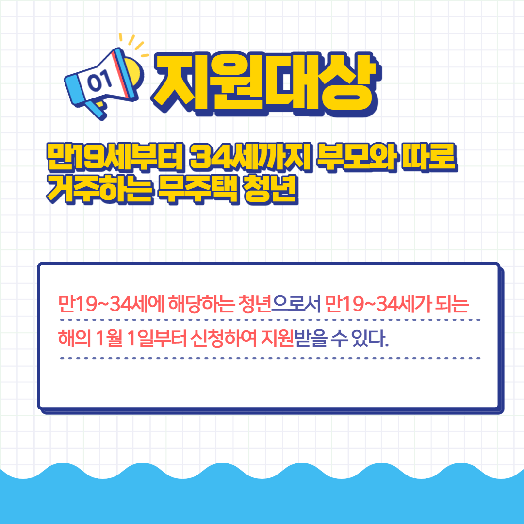 만19~34세에 해당하는 청년으로 만19~34세가 되는 해의 1월 1일부터 신청하여 지원받을 수 있습니다.