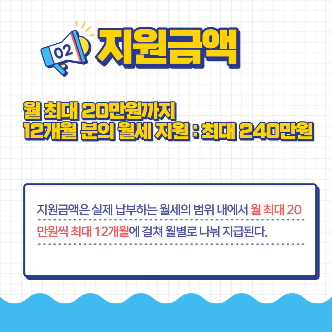 지원금액은 월 최대 20만원씩 최대 12개월로 240만원까지 지원이 가능합니다. 단 여기서 본인의 거주 환경이 바뀌면 지원이 중단되니 아래 조건을 꼭 확인하시길 바랍니다.