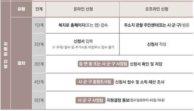 본인이 신청할 경우 복지로 사이트 또는 관할 읍.면.동사무소(또는 시.군.구청)에서 신청이 가능합니다.