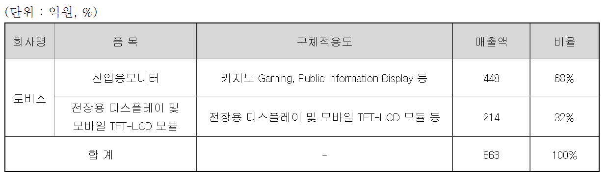 토비스는 카지노, 게이밍, 공공정보디스플레이 등에 사용되는 산업용 모니터와 전장용 디스플레이 및 휴대폰, 태블릿 등에 사용되는 TFT-LCD 모듈을 주 사업으로 영위하고 있습니다.
