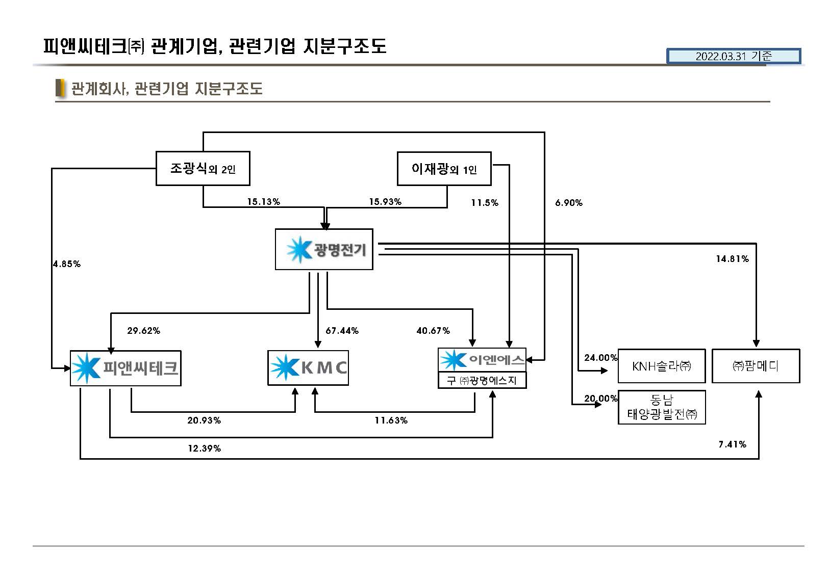 | 조광식 | 남 | 1958.12 | 사내이사 | 83.02 광운대 전기공학과 졸업 82.02~03.04 광명전기근무 03.06~15.11 광명전기 대표이사 광명그릅 회장 04.06~현재 피앤씨테크 대표이사 |