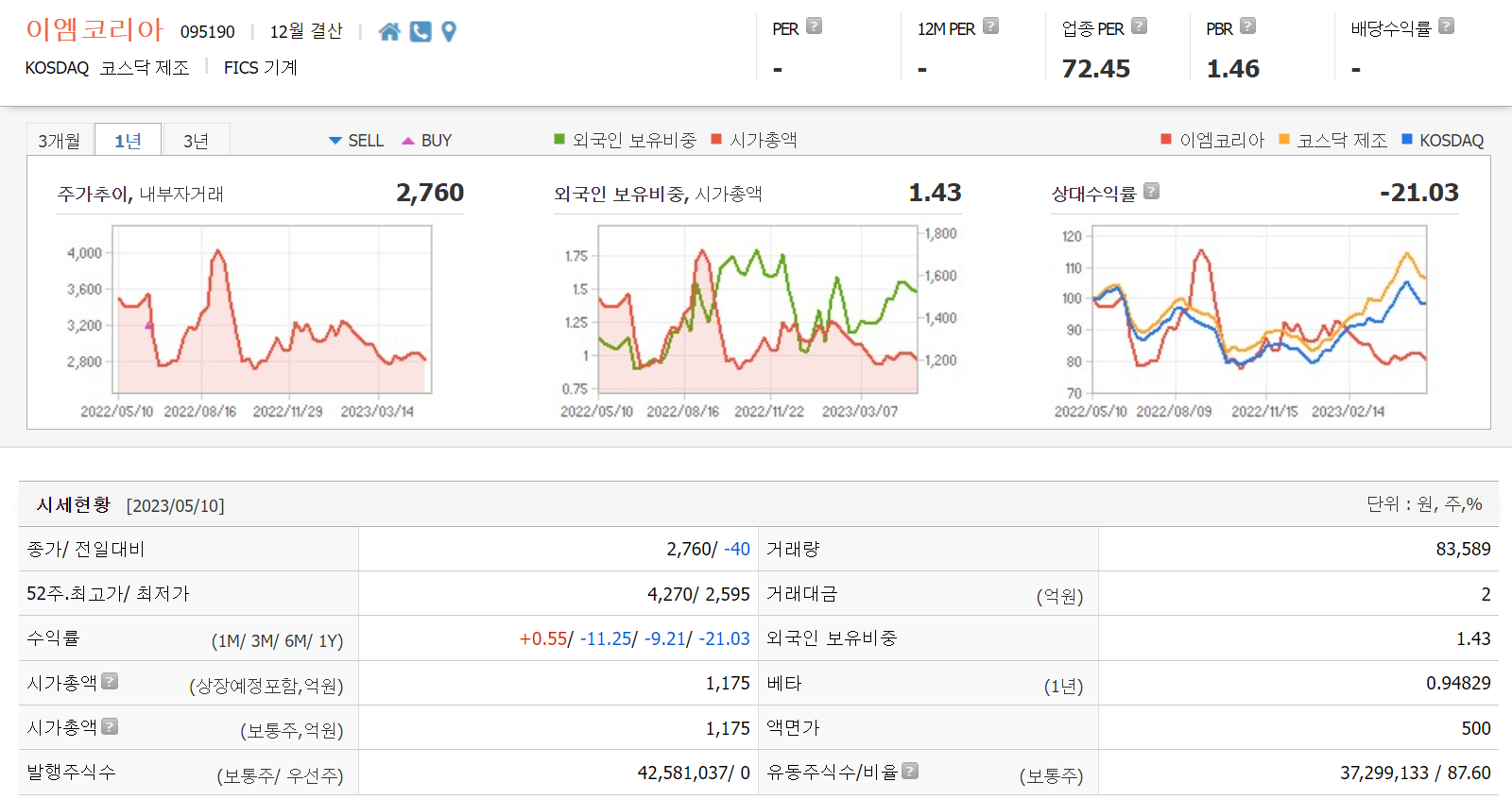 이엠코리아는 KOSDAQ 시장에 2007/10/29에 상장한 기업이며 종목코드는 095190입니다.