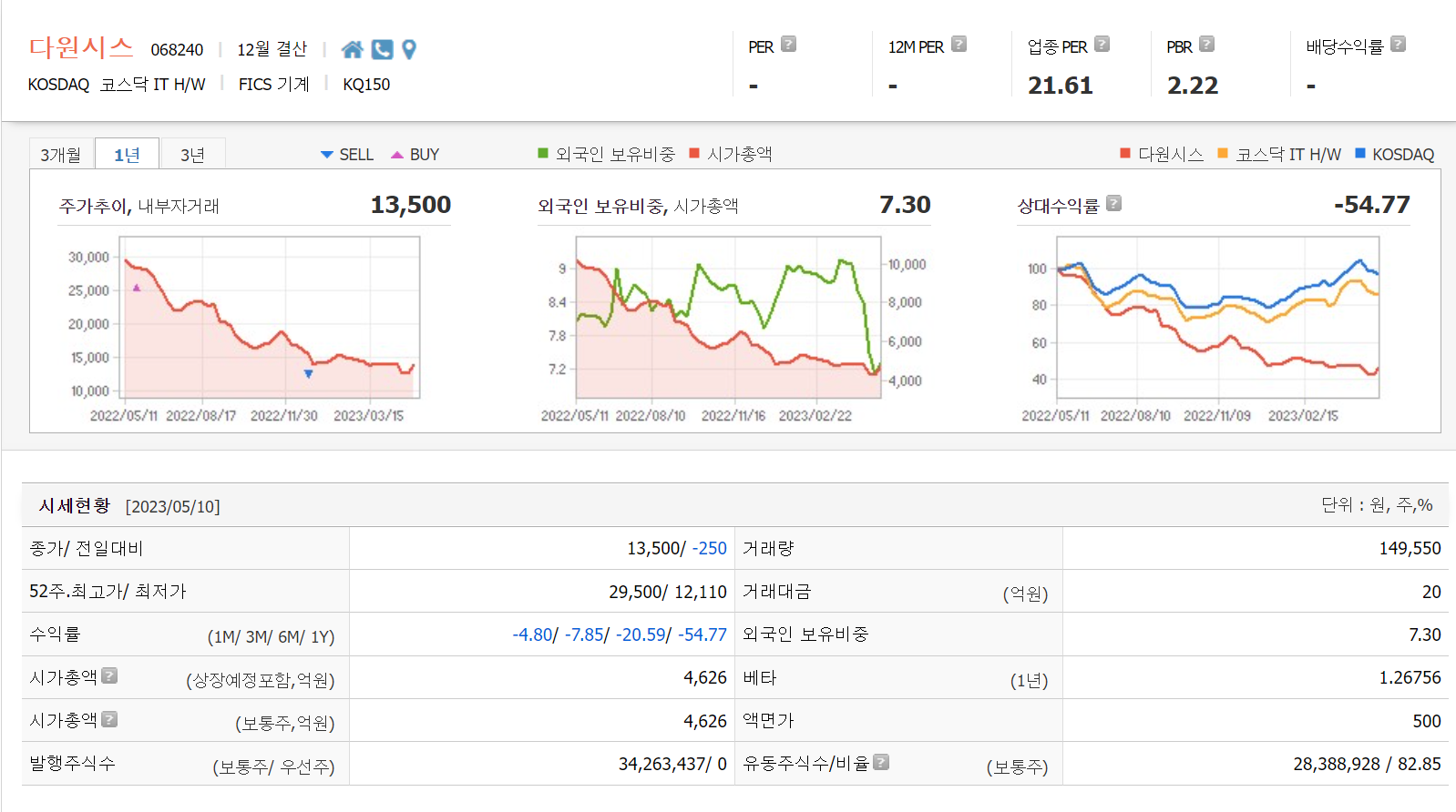 다원시스는 KOSDAQ 시장에 2010/09/14에 상장한 기업이며 종목코드는 068240입니다.