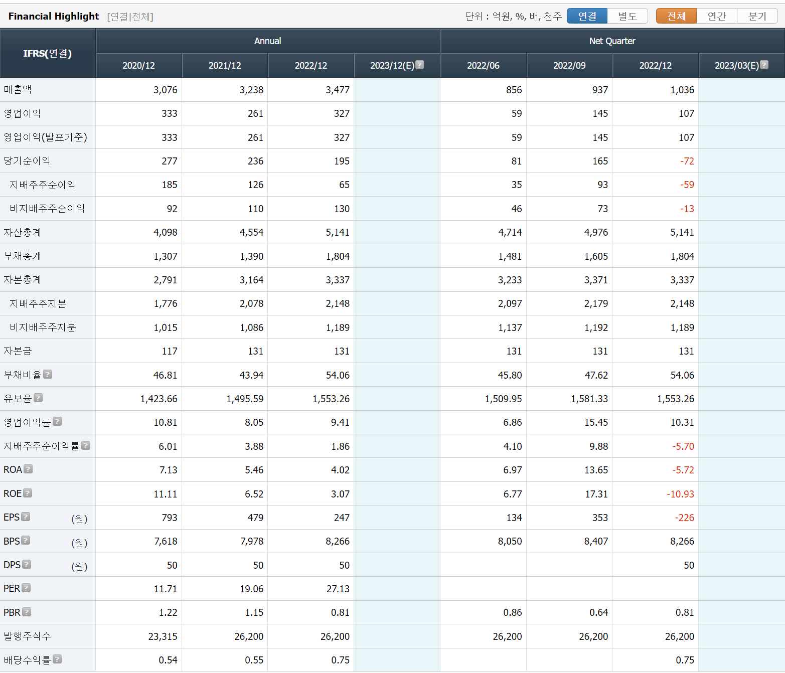 부채비율은 115.43, 유보율은277.83로 다소 아쉬운 수준을 유지하고 있습니다.