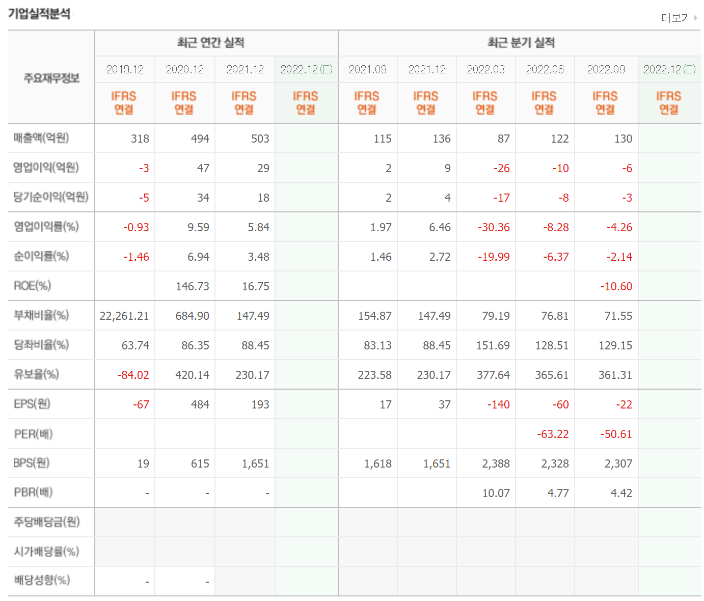 매년 3천억 이상의 매출을 달성하고 있으며 2021년 흑자전환을 하였습니다. 부채비율은 다소 높은 편입니다. 유보율은 마이너스를 유지하고 있어 투자에 유의할 필요가 있습니다.