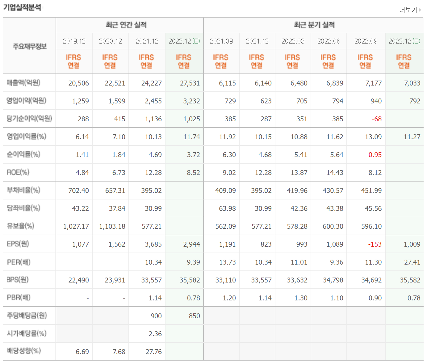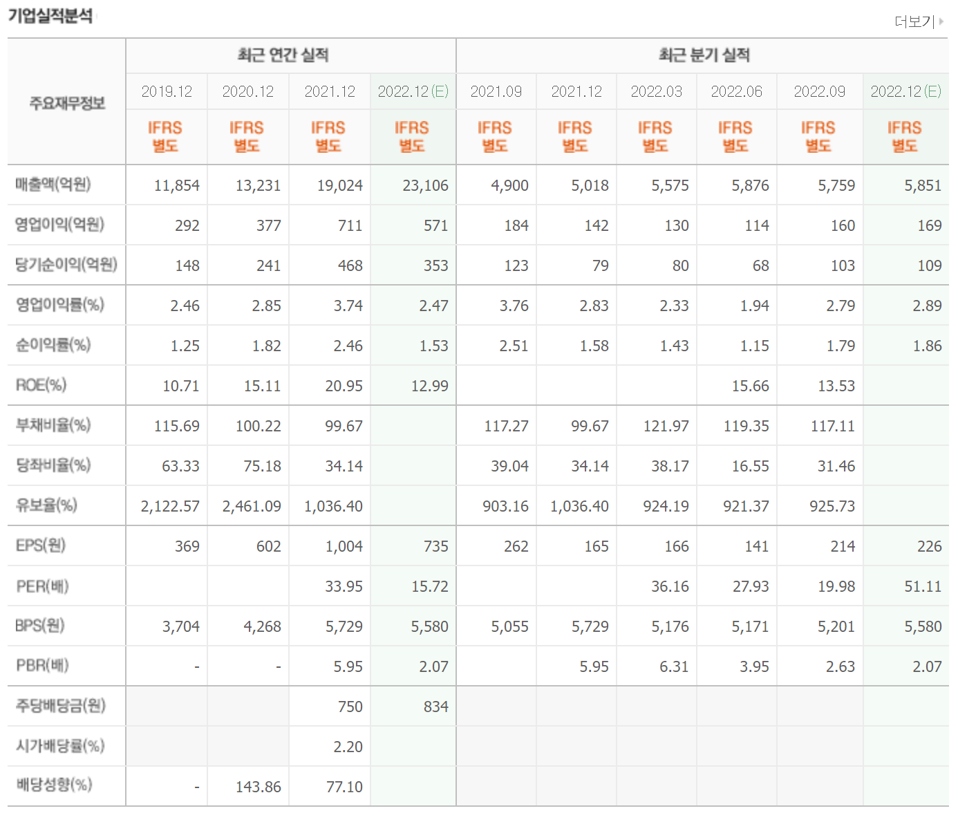 매년 1조 이상의 매출을 달성하고 있으며 2022년까지 매출과 당기순이익은 지속적으로 증가하고 있습니다. 2022년 컨센서스에서도 2.3조의 매출과 350억의 당기순이익을 올릴 것으로 보고 있습니다. 유보율과 부채비율 모두 준수한 편입니다.