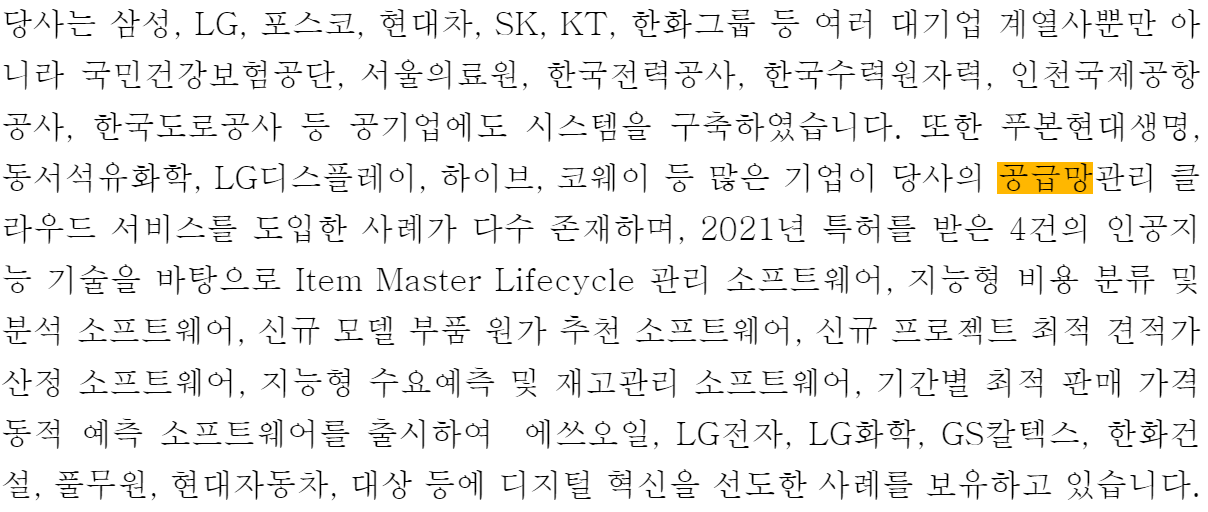 현대차에 공급망 관리 클라우드 서비스를 제공하였으며 재고관리 및 판매가격 예측 소프트웨어를 출시하였습니다. 현대차가 중고차 관련 사업을 진행할 경우 엠로의 공급망 관리 서비스를 적용할 가능성이 있기에 현대차의 중고차 사업 진출에 따른 수혜주로 언급되고 있습니다.