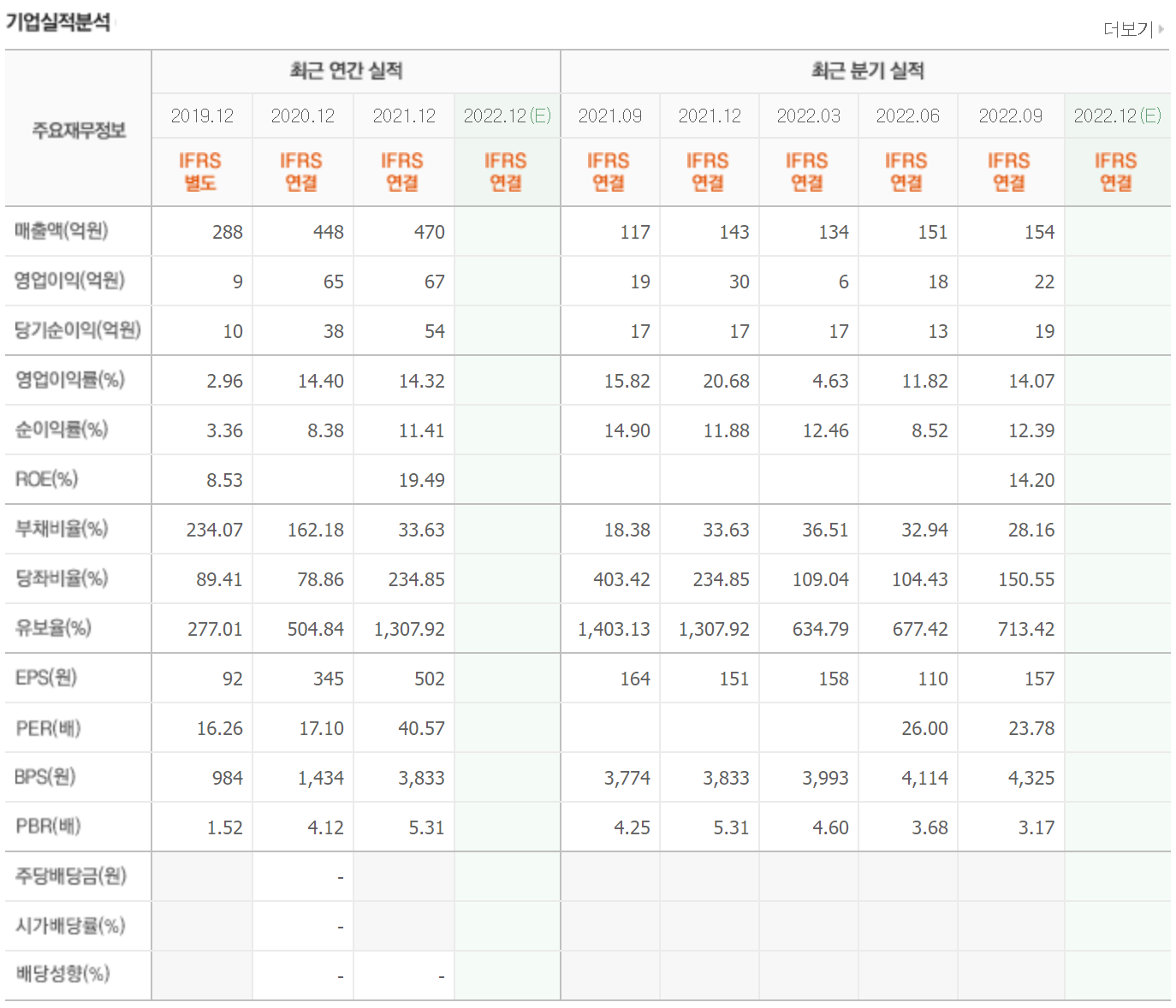 매년 매출은 성장세에 있습니다 2019년 300억으로 시작하여 2021년 500억의 매출을 달성하였습니다. 상장 전에는 부채비율이 상장이 높은 편이었으나 상장 후 유보율과 부채비율은 적정선을 유지하고 있습니다. 2022년 영업이익과 당기순이익이 좋지 않은 모습이 있습니다.