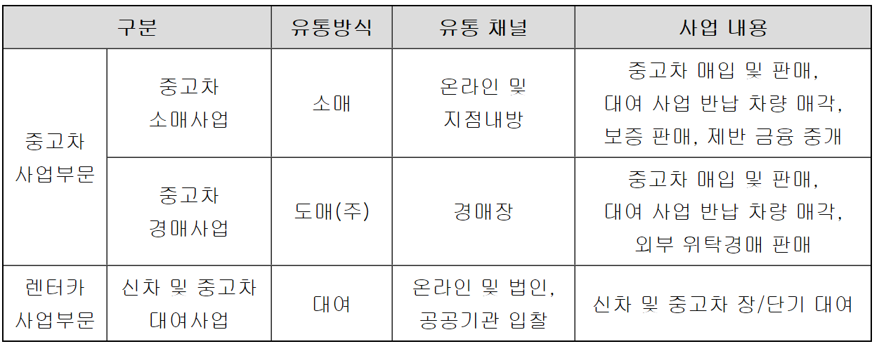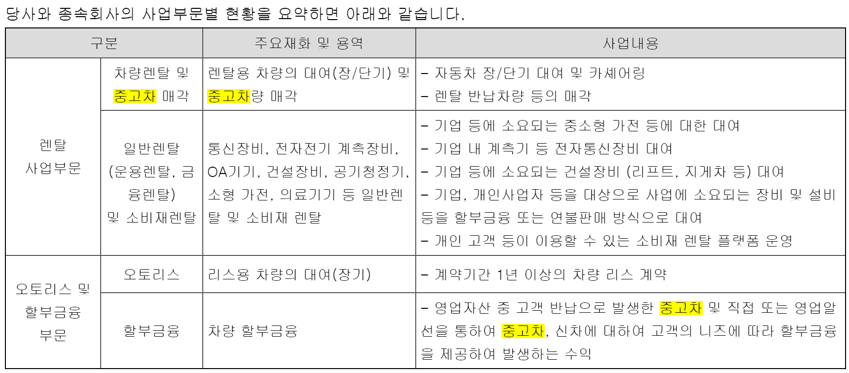 롯데렌탈은 렌탈 사업부문(차량렌탈 및 중고차 매각 등 차량관련 사업과 계측장비, 생활가전 등 일반렌탈 및 소비재렌탈 사업)과 종속회사가 사업을 영위하고 있는 오토리스 및 할부금융부문으로 사업을 구분할 수 있습니다.