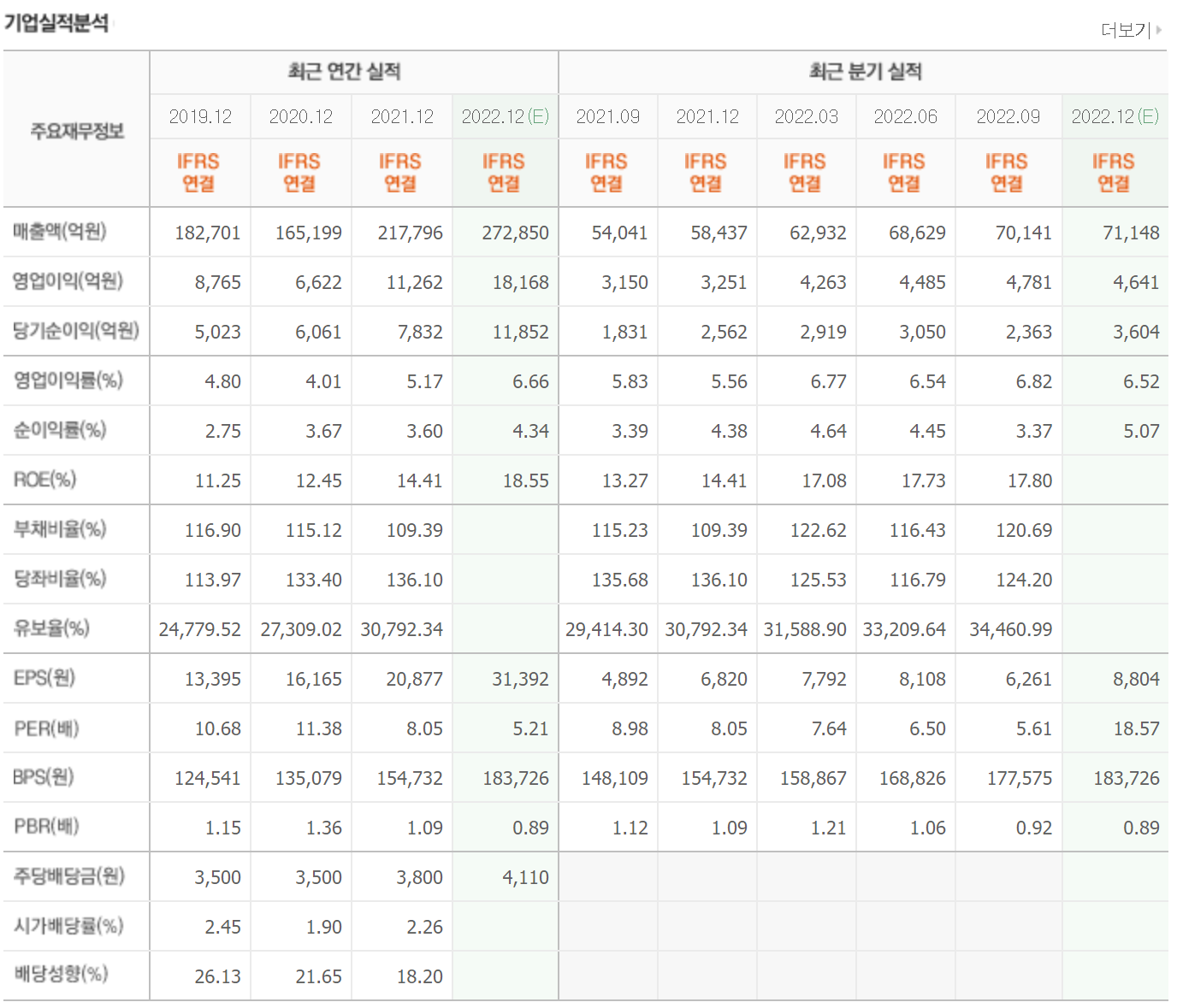 매년 20조 전후의 매출을 달성하고 있으며 2021년은 20조를 돌파하였습니다. 2022년 27조를 달성할 것으로 컨센서스에서 예측하고 있습니다. 유보율과 부채비율은 매우 우수한 상태입니다.