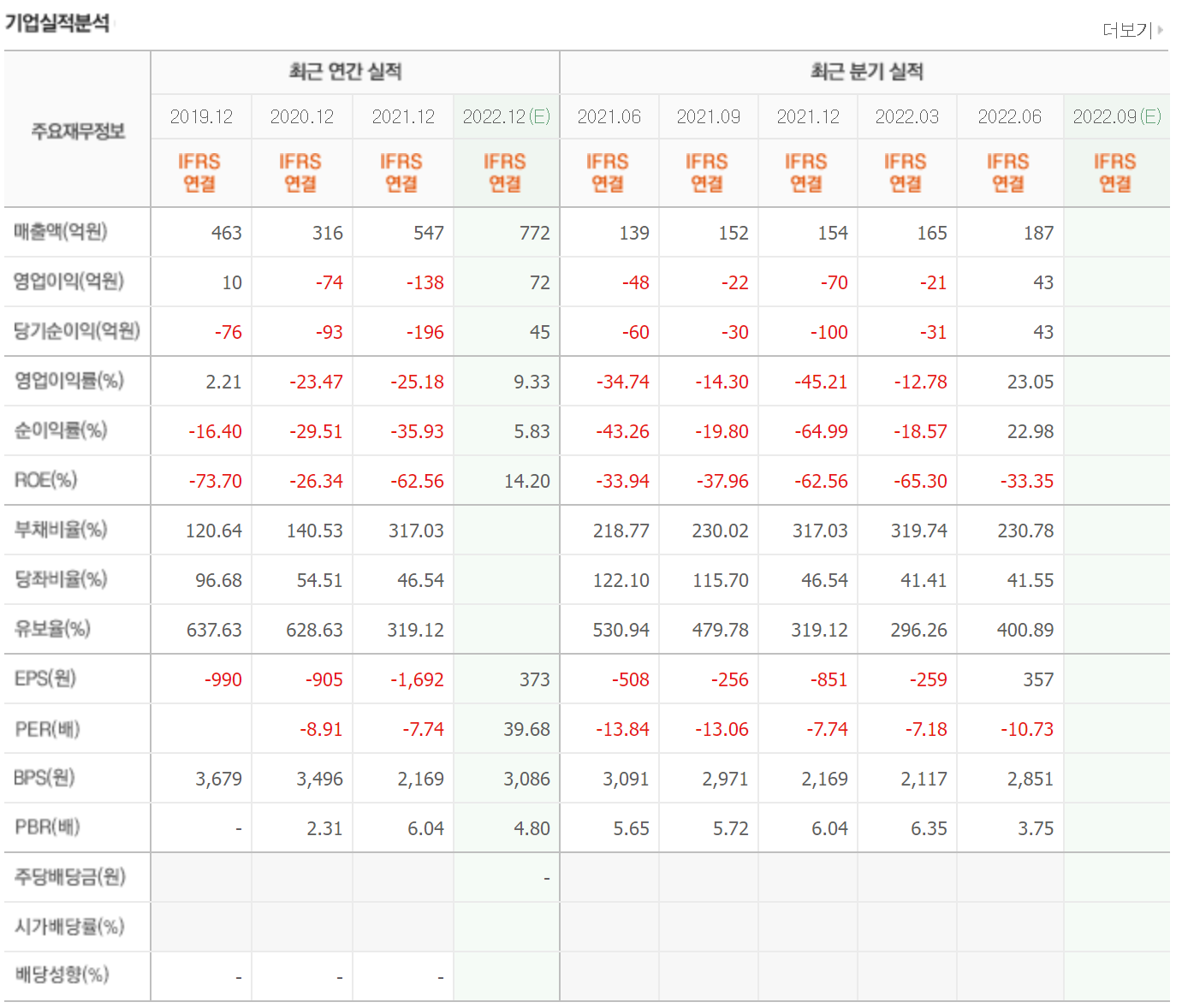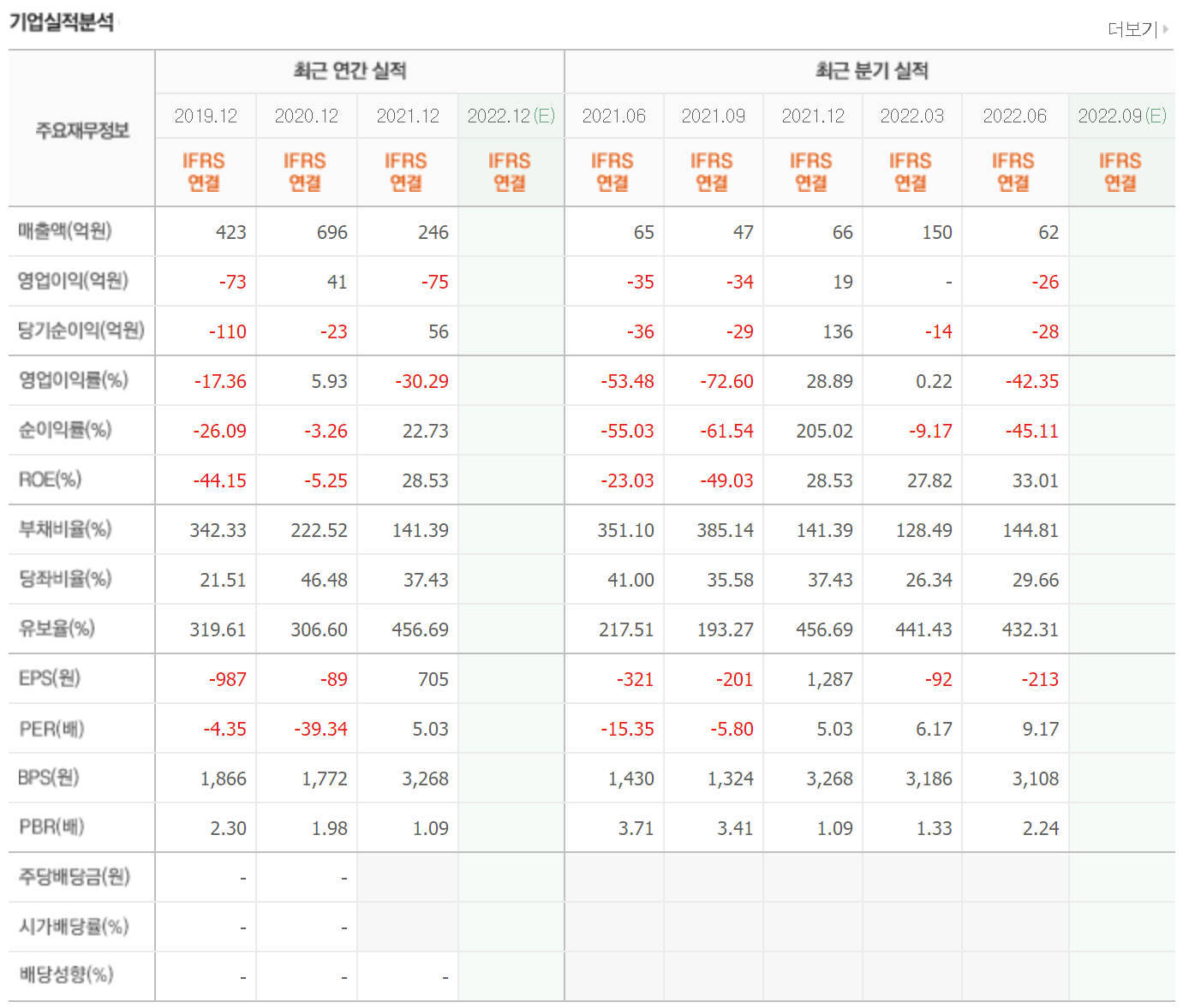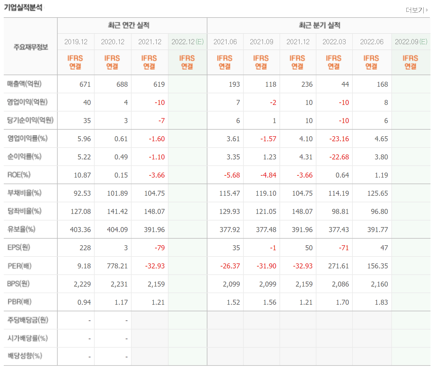 매출은 지속적으로 600억 정도를 유지하고 있으며 영업이익과 당기순이익은 2021년 적자전환했습니다. 매출에 큰 변동이 없으므로 차트가 낮을 때 진입하면 큰 리스크가 없는 회사입니다.