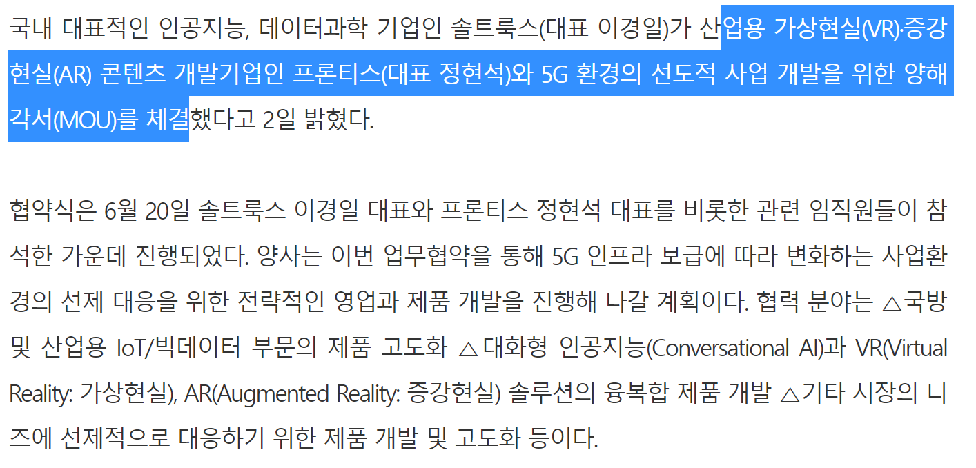 솔트룩스는 산업용 가상현실(VR)·증강현실(AR) 콘텐츠 개발기업인 프론티스와 5G 환경의 선도적 사업 개발을 위한 양해각서(MOU)를 체결하면서 VR AR XR 관련주로 편입되었습니다.